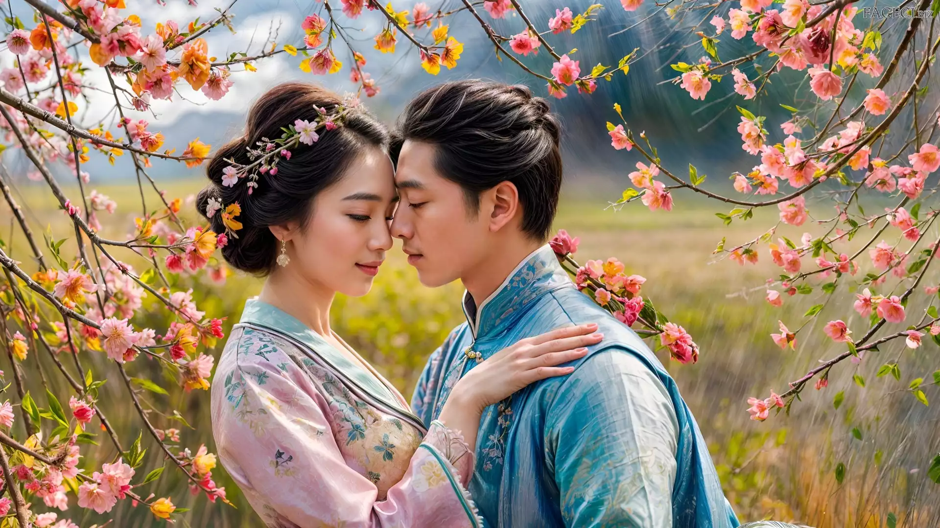 Zakochani, Azjaci, Kobieta, Mężczyzna, Kwiaty, Gałęzie - faceci.biz